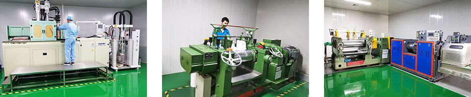 厂房占地面积为4000平方米,员工60人,设置了从开模、打样、生产到包装出货各独立车间和仓库,配置了15台硫化机、1台液态注射、2台炼胶机、1台预成型机等。